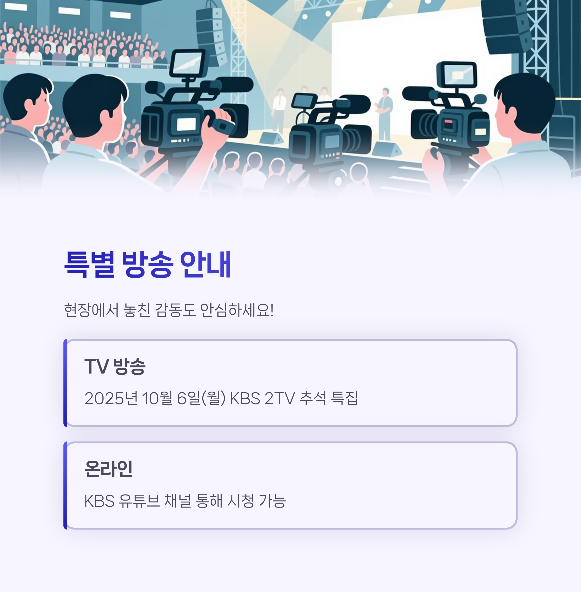- 방송: 2025년 10월 6일(월) KBS 2TV 추석 특집 방송