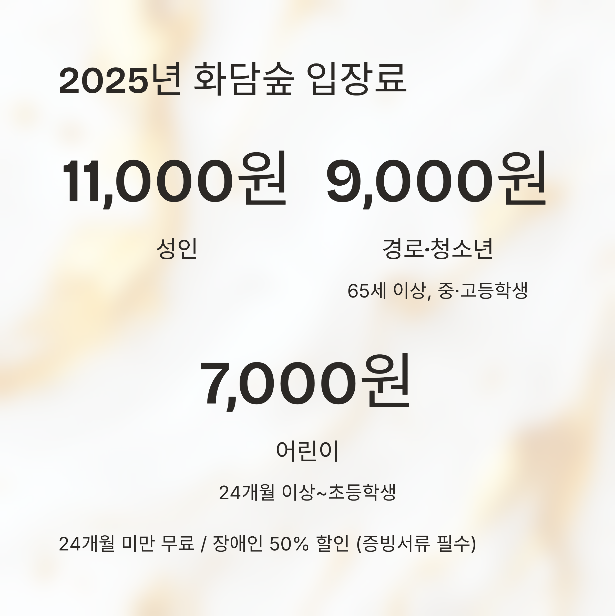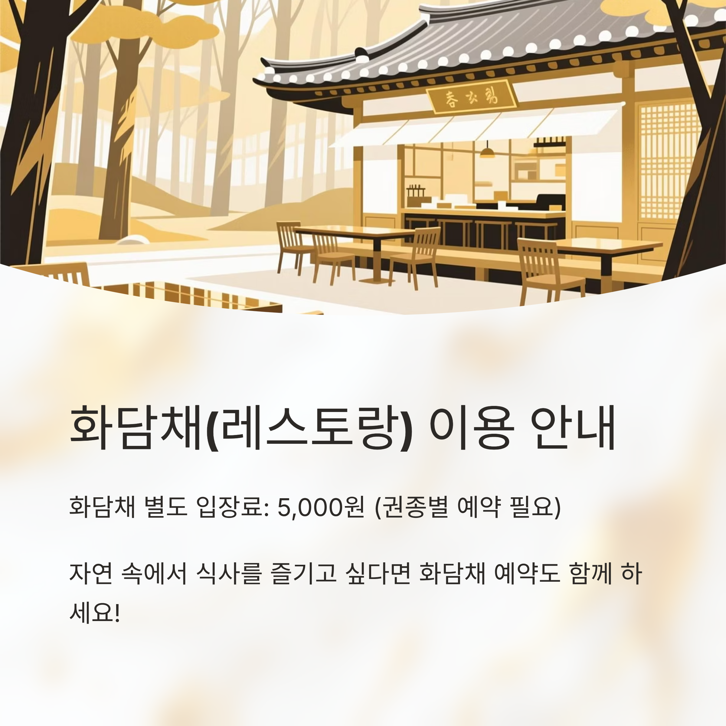 → 주차 후 셔틀버스를 타고 입장 게이트 이동 - 화담채(레스토랑) 별도 입장료: 5,000원 (권종별 예약 필요)
