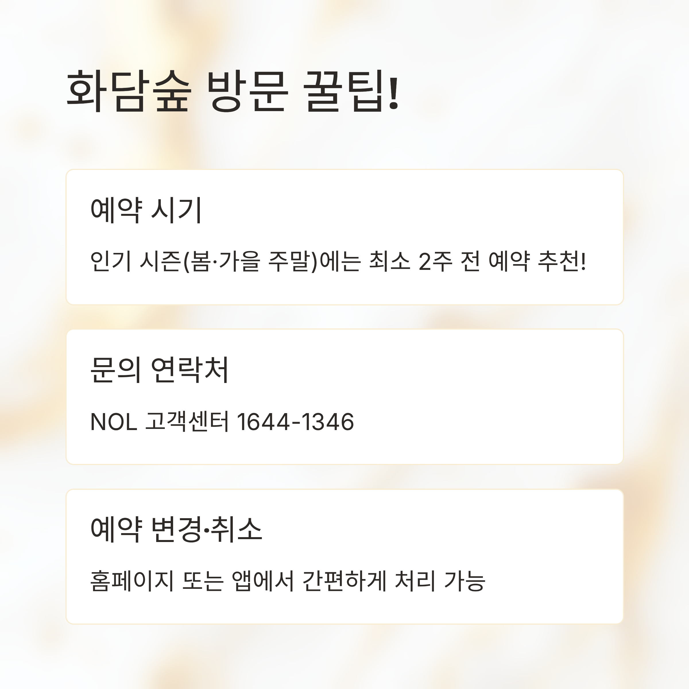 A2. 네, 가능합니다. 예약 내역은 화담숲 홈페이지 또는 NOL 앱·웹에서 직접 변경·취소할 수 있습니다. 단, 예약일 임박 시 취소 규정에 따라 환불이 제한될 수 있으니 확인이 필요합니다.