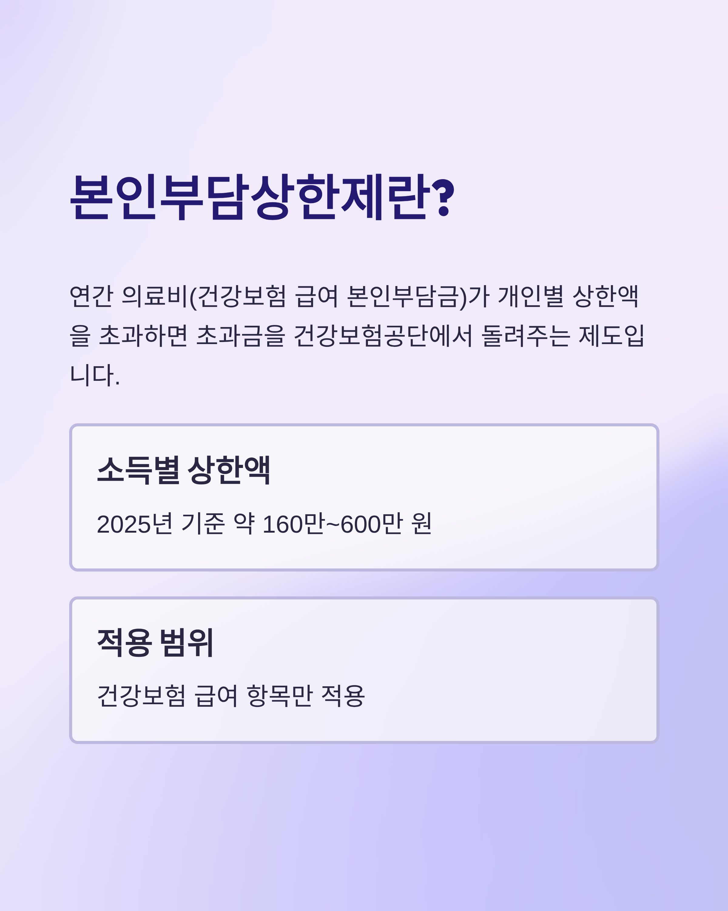 - 소득 수준에 따라 개인별 부담 상한액(2025년 기준 약 160만~600만 원)을 정해, 연간(1월~12월) 본인부담 의료비가 상한액을 넘는 경우 초과액을 환급.