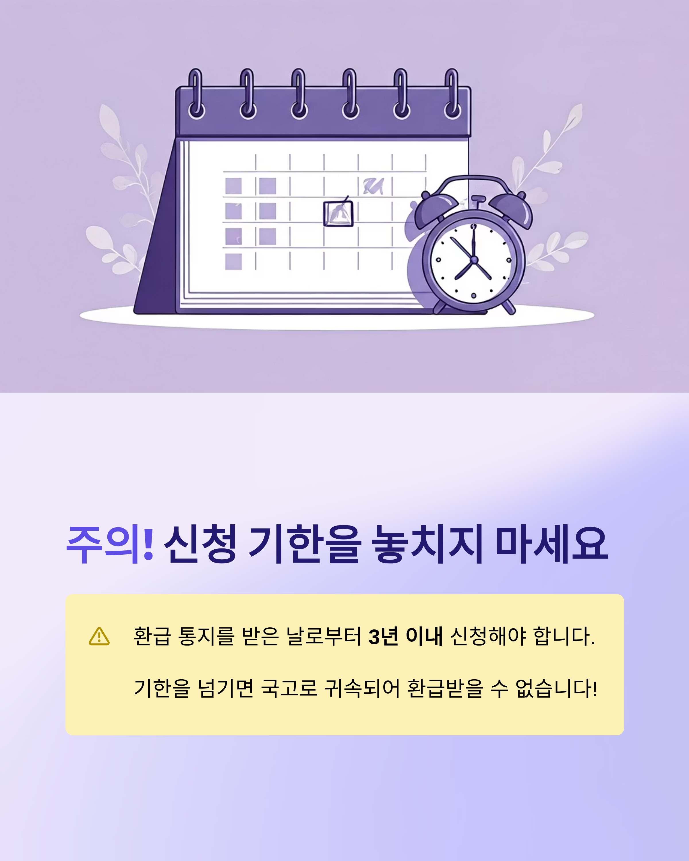⚠️ 주의: 환급 통지를 받은 날로부터 3년 이내 신청해야 하며, 기한을 넘기면 국고로 귀속되어 환급받을 수 없습니다.