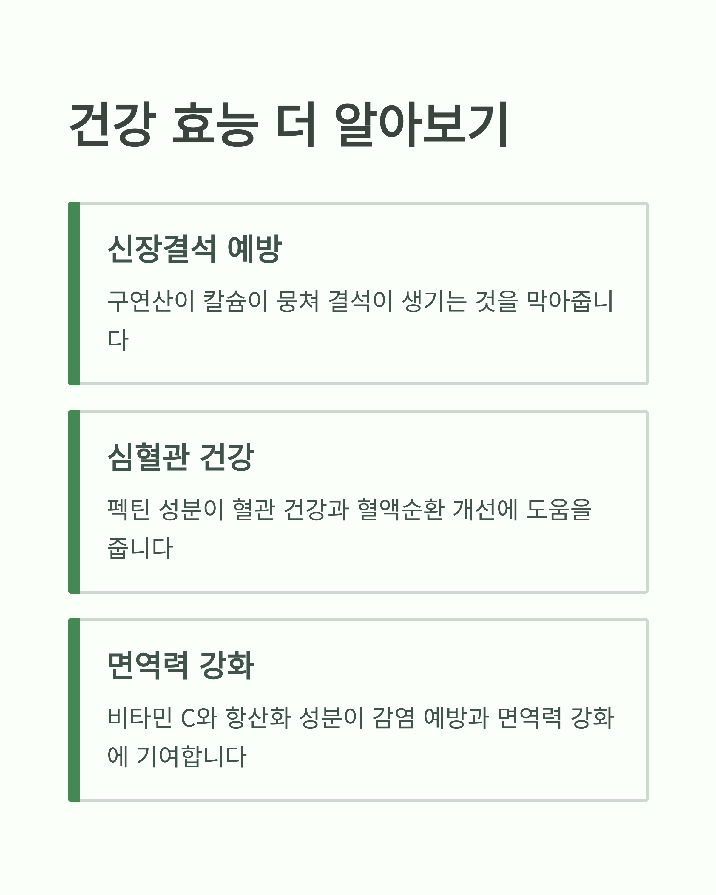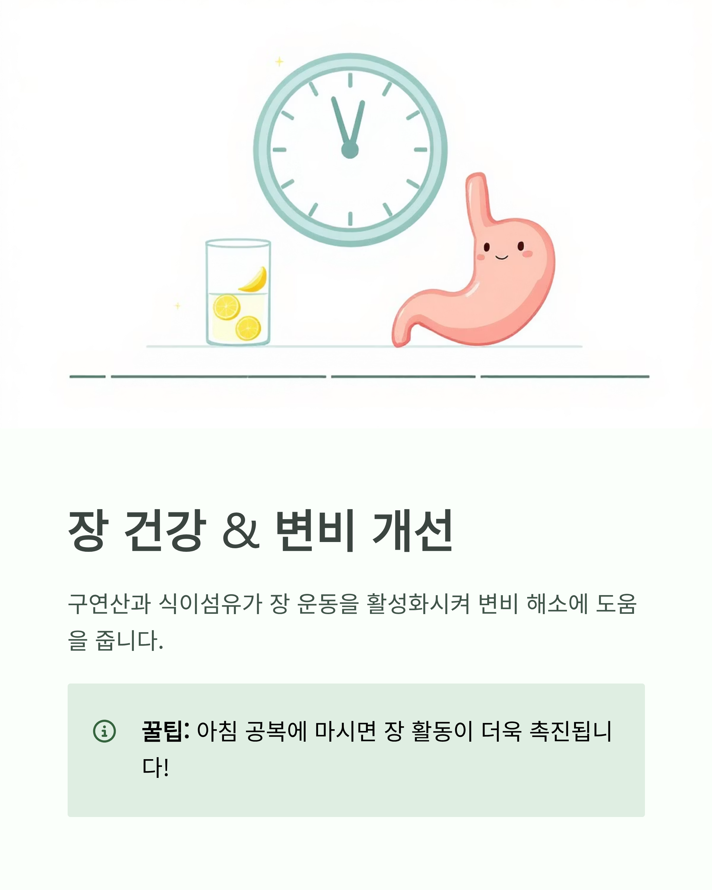 구연산과 식이섬유가 장 운동을 활성화시켜 변비 해소에 좋습니다. 특히 아침 공복에 마시면 장 활동이 촉진됩니다.