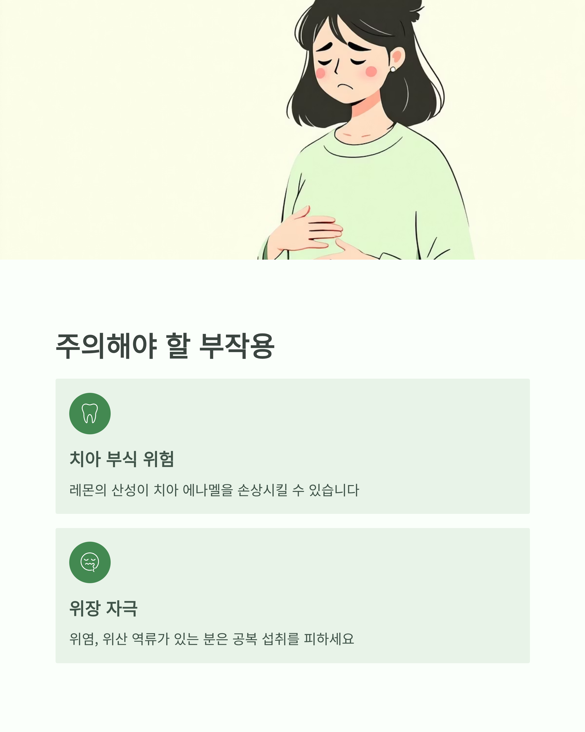 가장 대표적인 부작용은 치아 부식과 위장 자극입니다. 치아 건강을 위해 빨대를 사용하거나 마신 후 물로 입을 헹궈 주는 습관이 필요하며, 위장 질환이 있는 경우 과다 섭취를 피해야 합니다.