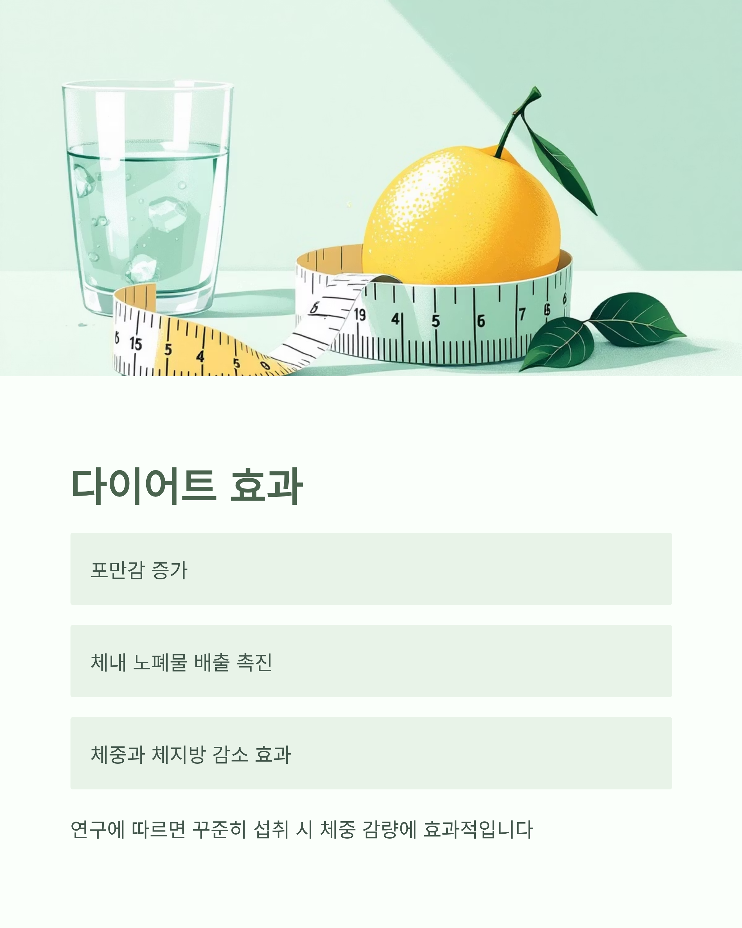 레몬수는 포만감을 주고 체내 노폐물 배출을 돕습니다. 연구에 따르면 꾸준히 섭취하면 체중과 체지방 감소 효과도 있습니다.