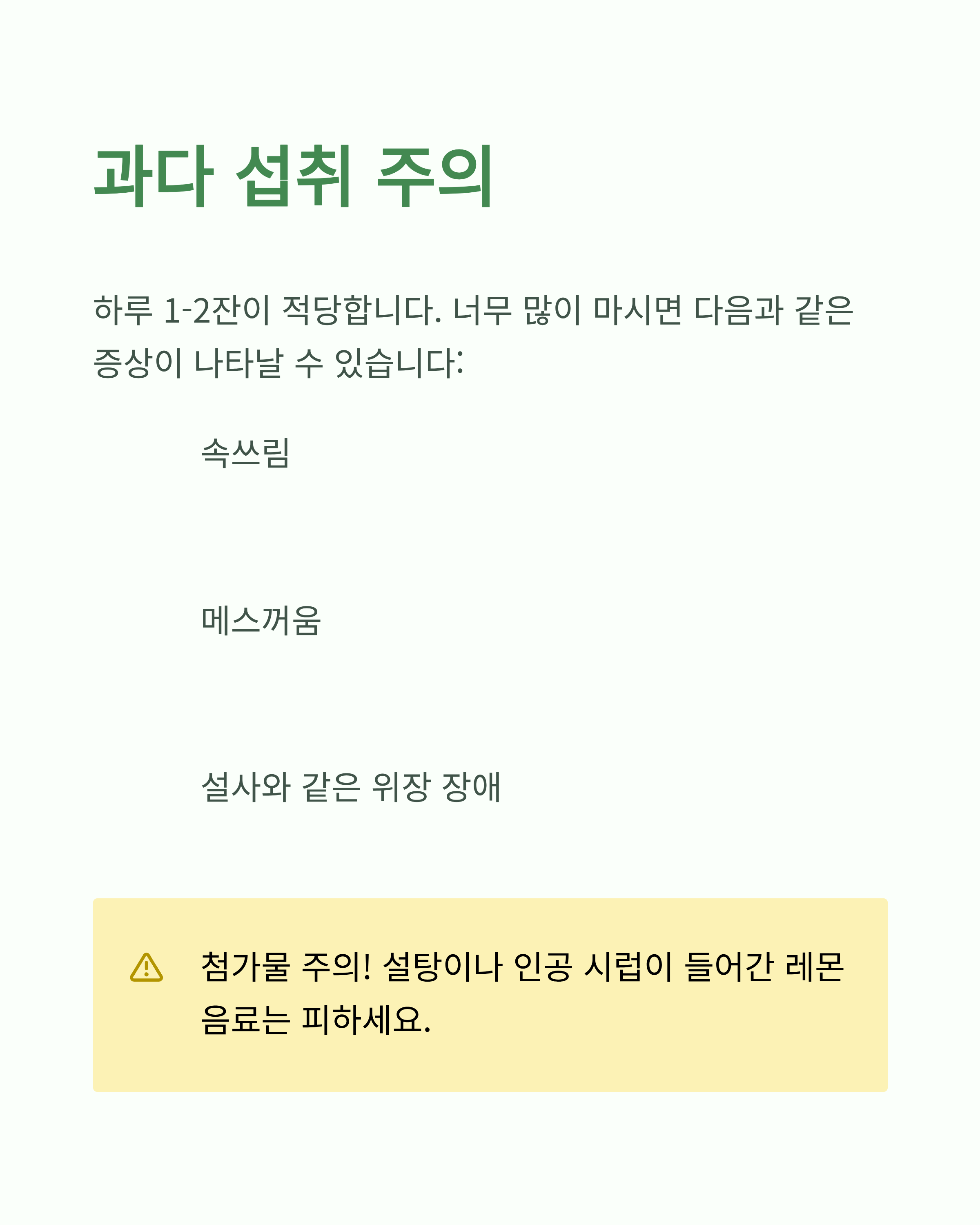 하루 1~2잔 정도가 적당합니다. 너무 많이 마시면 속쓰림, 메스꺼움, 설사 같은 위장 장애가 생길 수 있습니다. - 첨가물 주의