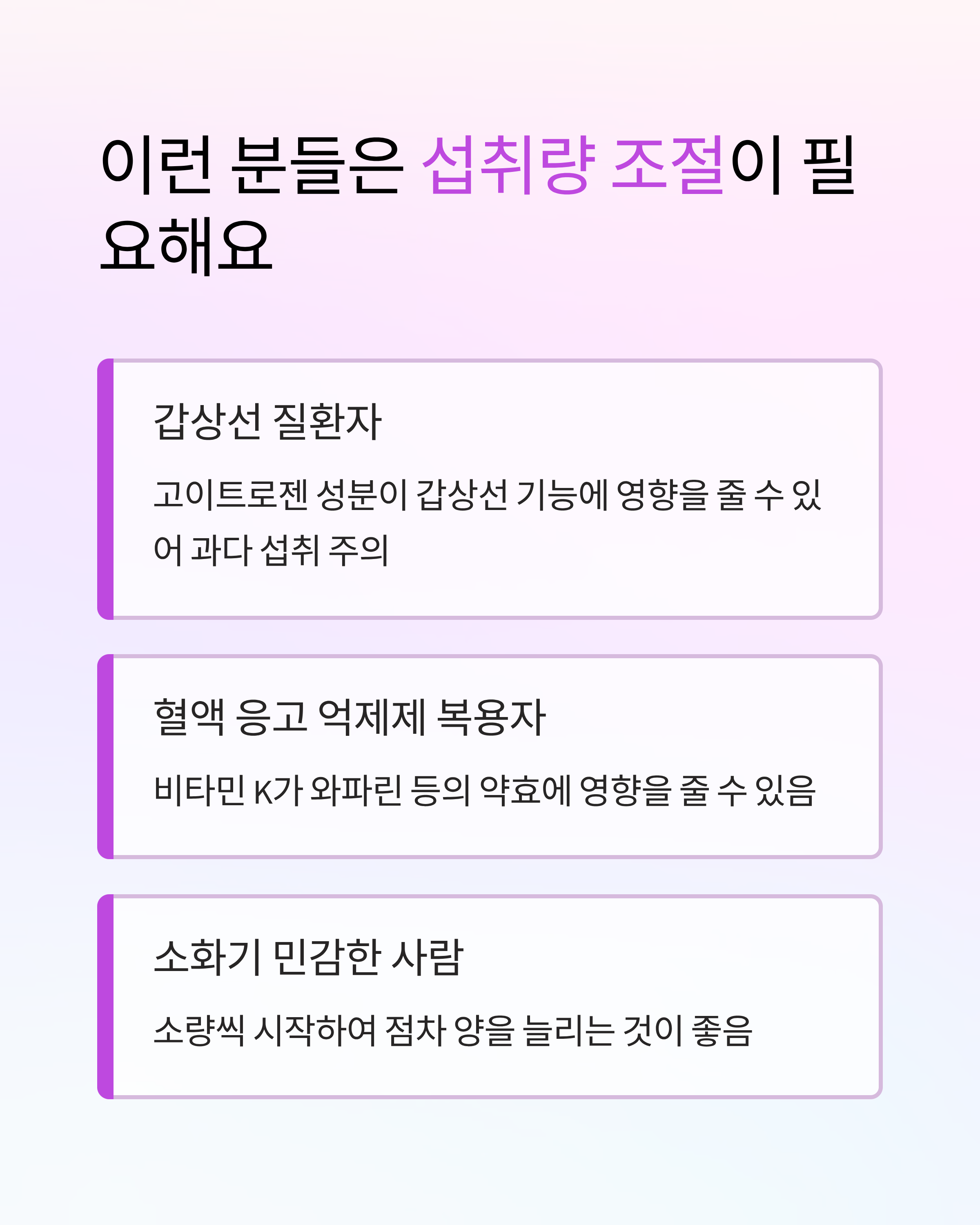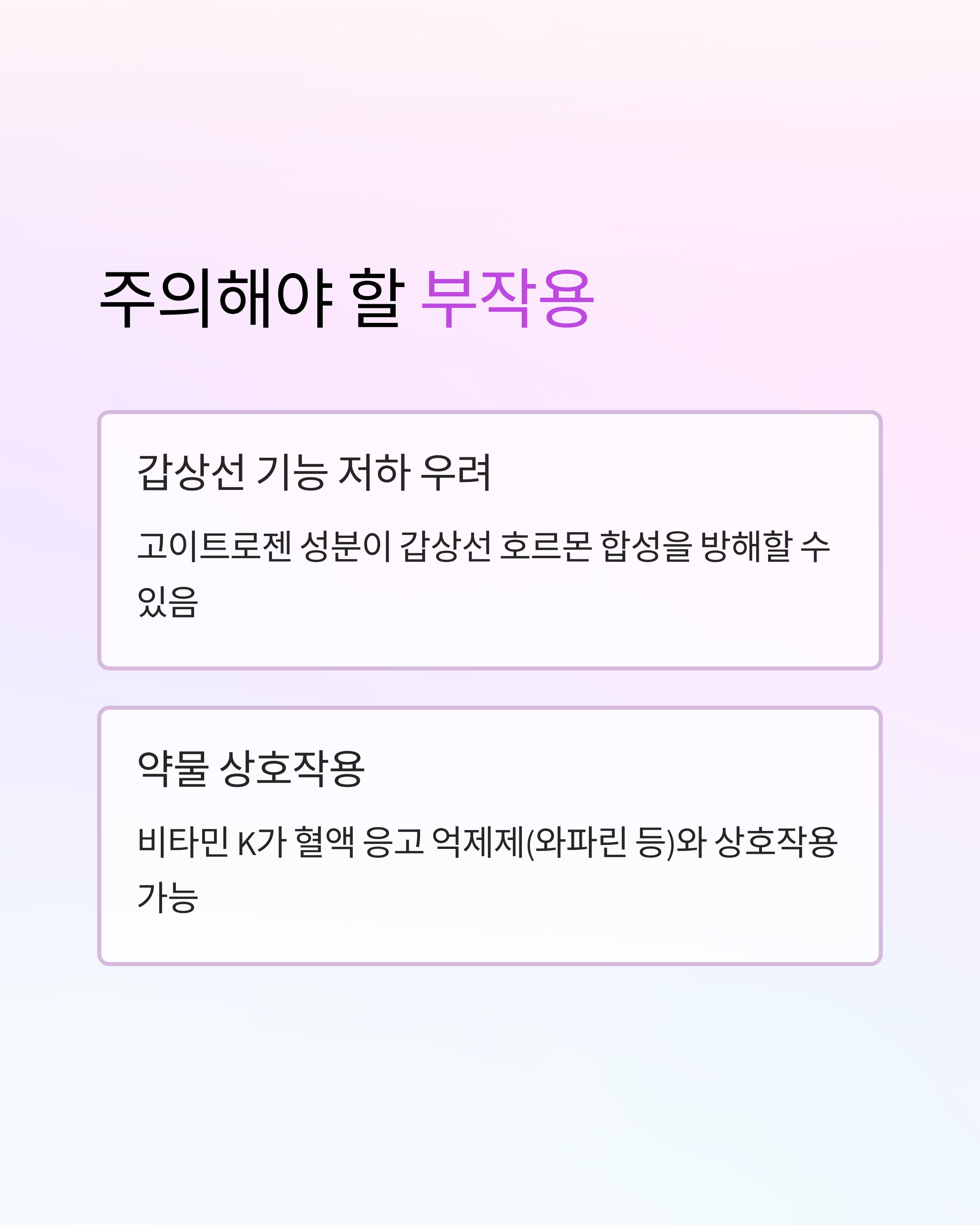 - 약물 상호작용: 비타민 K가 풍부해 혈액 응고 억제제(와파린 등) 복용자에게 영향을 줄 수 있습니다.