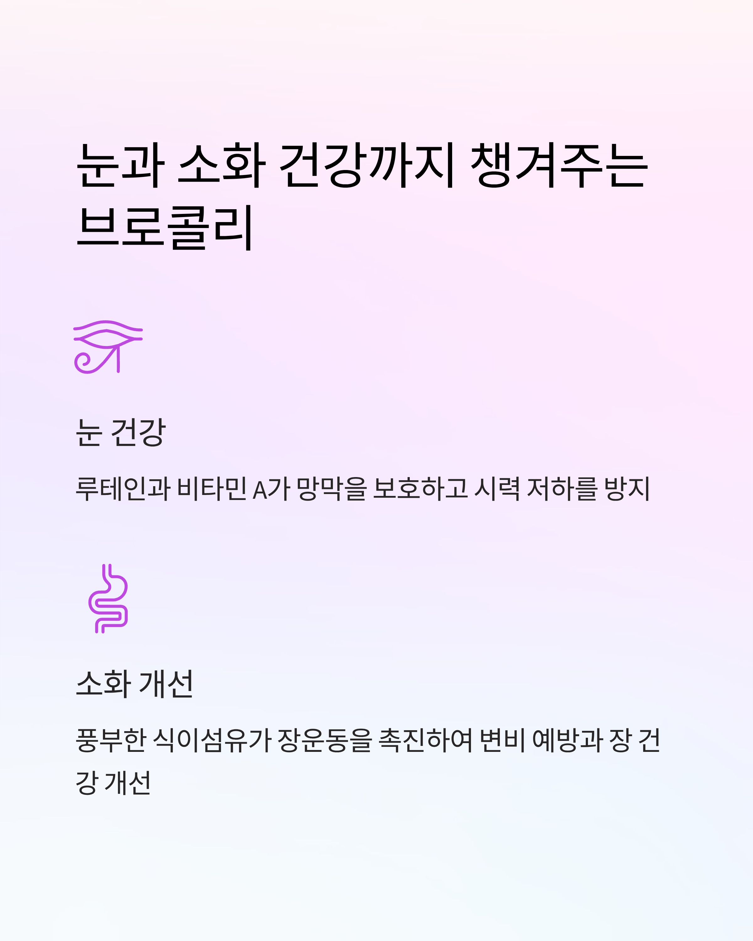 브로콜리 속 루테인과 비타민 A는 눈의 망막을 보호하고 시력 저하를 막아줍니다.