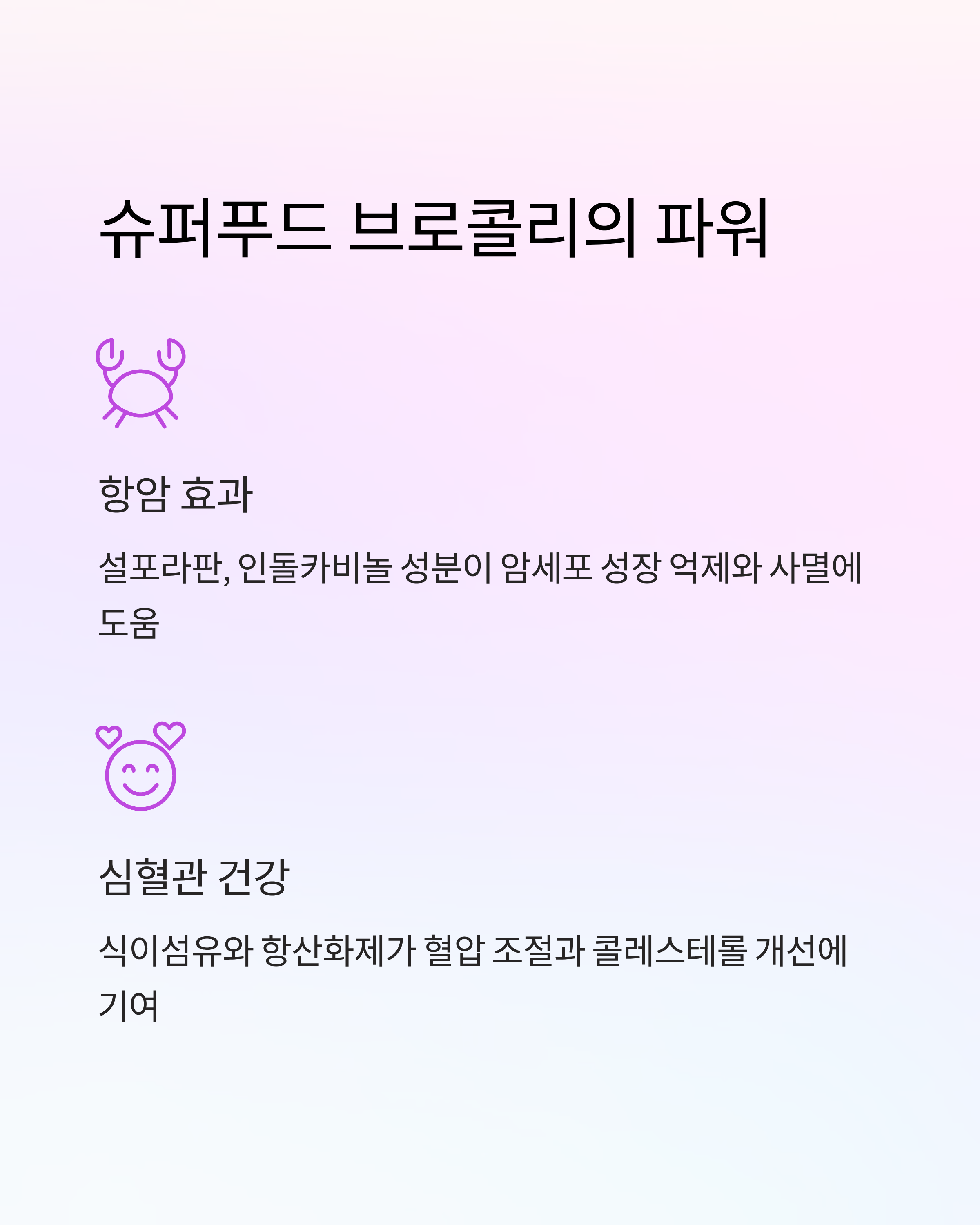 브로콜리는 항암·심혈관·뼈 건강·면역력 강화에 효과적인 채소로, 적절히 섭취하면 매우 유익합니다. 그러나 갑상선 질환자, 특정 약물 복용자, 장이 약한 사람은 섭취량을 조절해야 하며, 세척·보관 방법을 잘 지키는 것이 중요합니다.