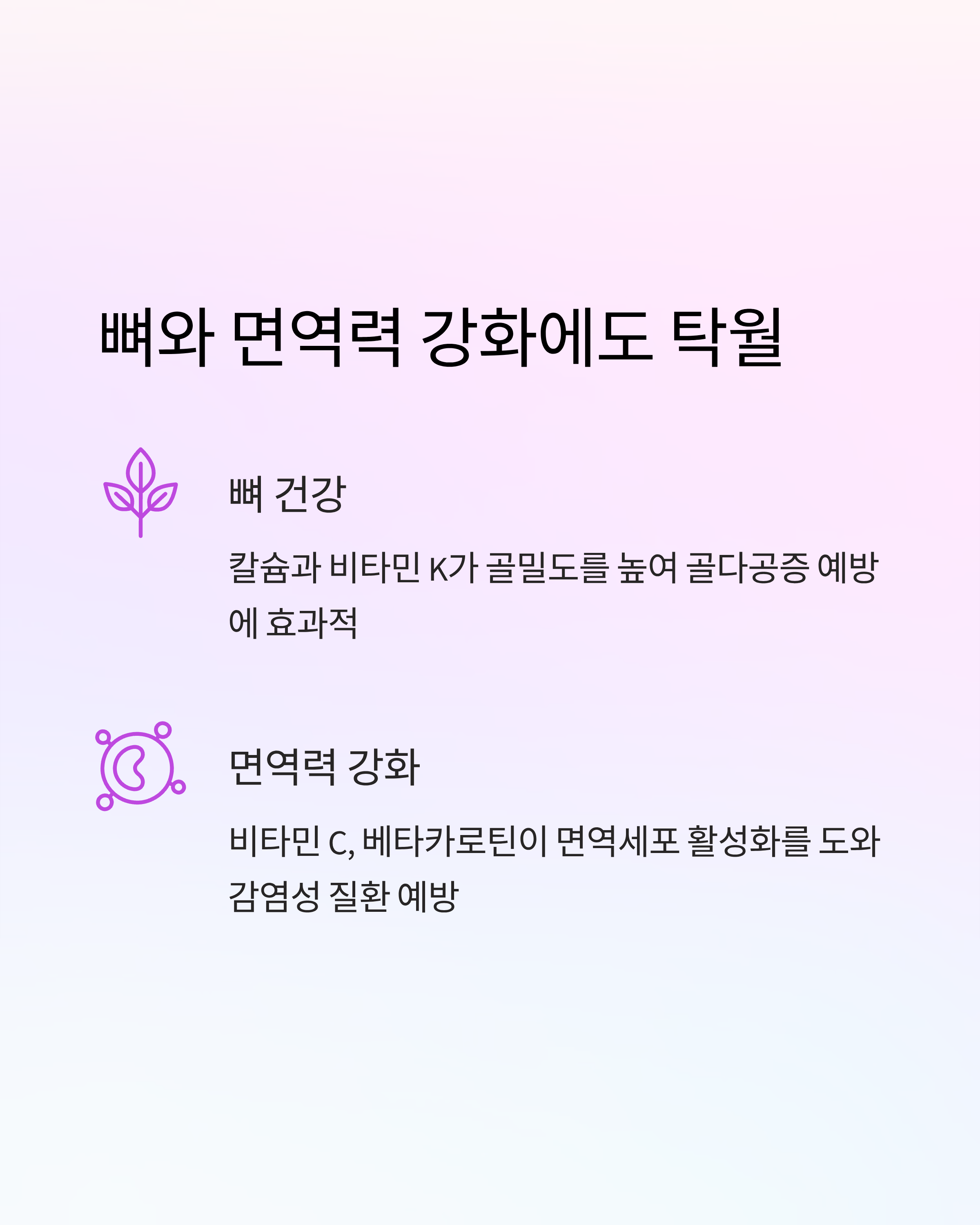 비타민 C, 베타카로틴 등 항산화 영양소가 면역세포 활성화를 도와 각종 감염성 질환 예방에 도움을 줍니다.