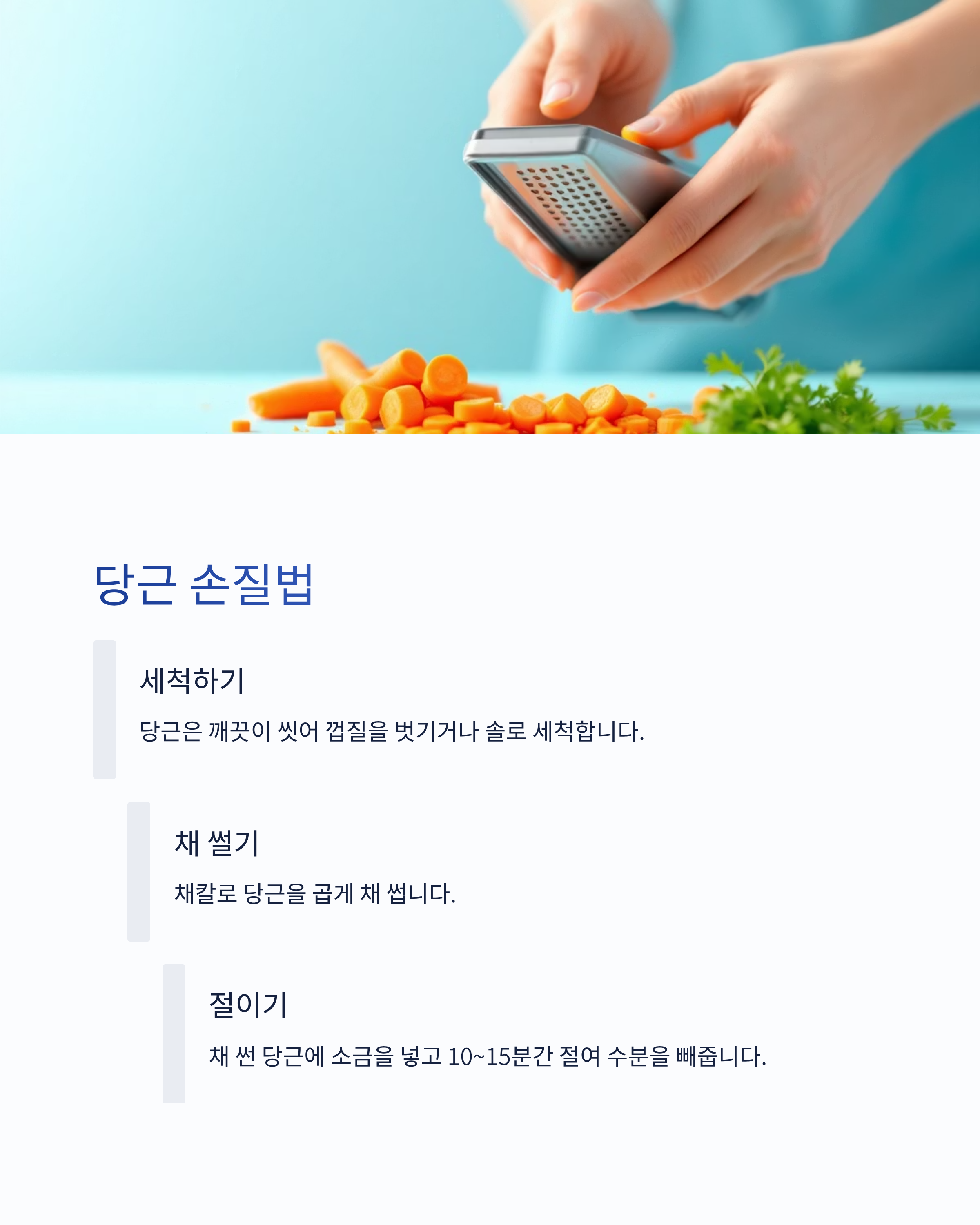 - 절여진 당근은 살짝만 짜내어 아삭한 식감을 살립니다.