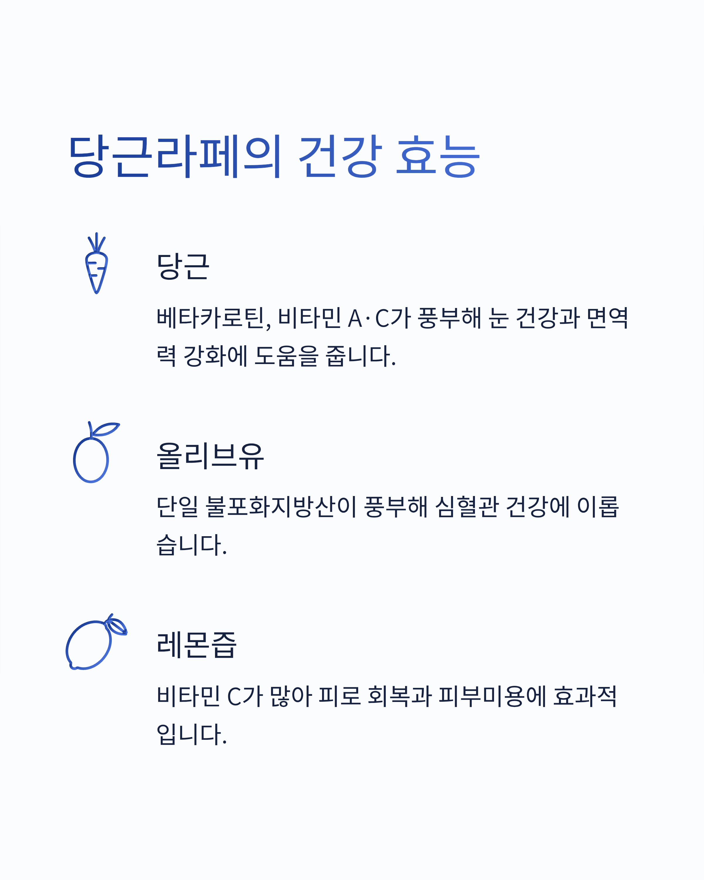 - 당근: 베타카로틴, 비타민 A·C가 풍부해 눈 건강·면역력 강화에 도움.