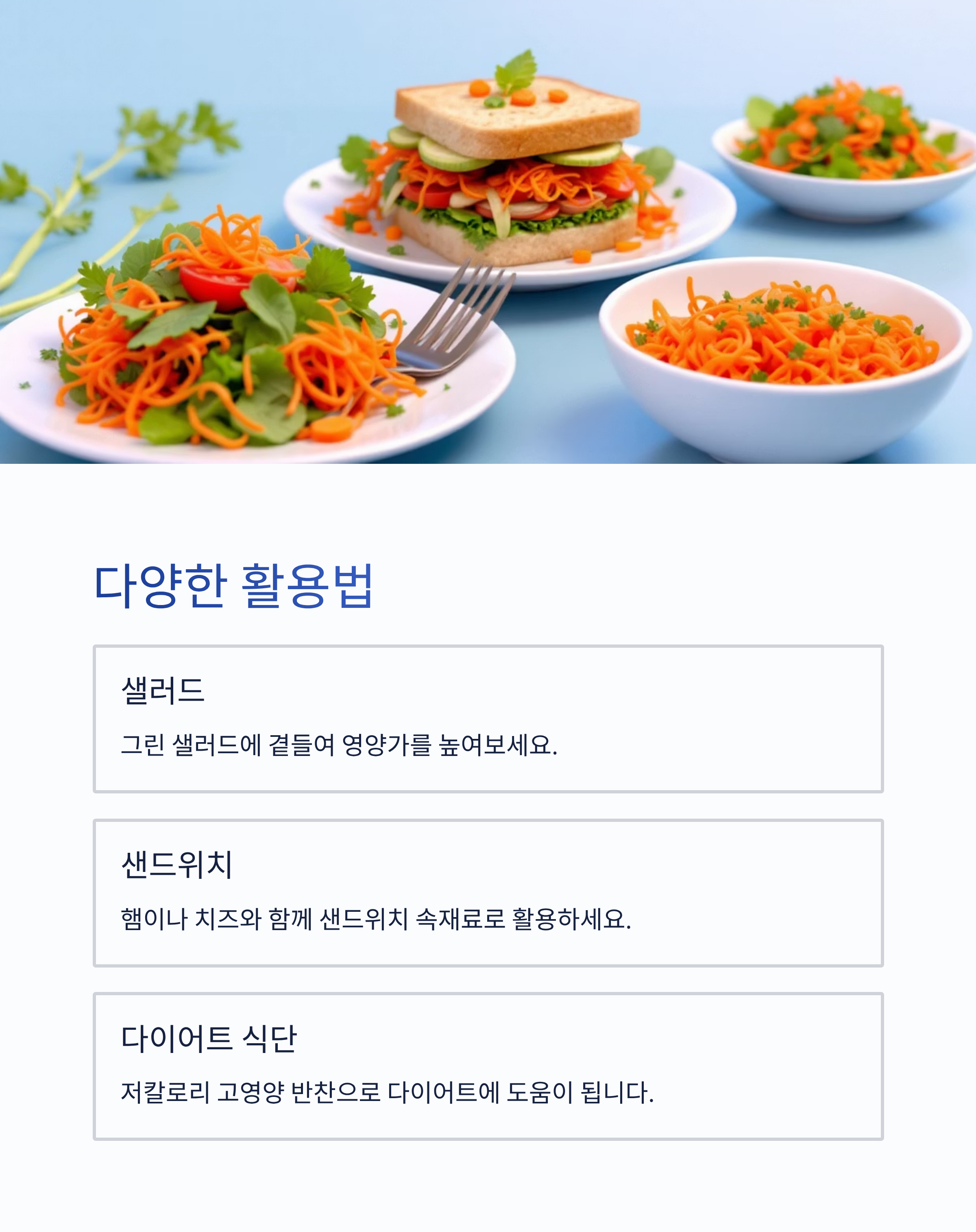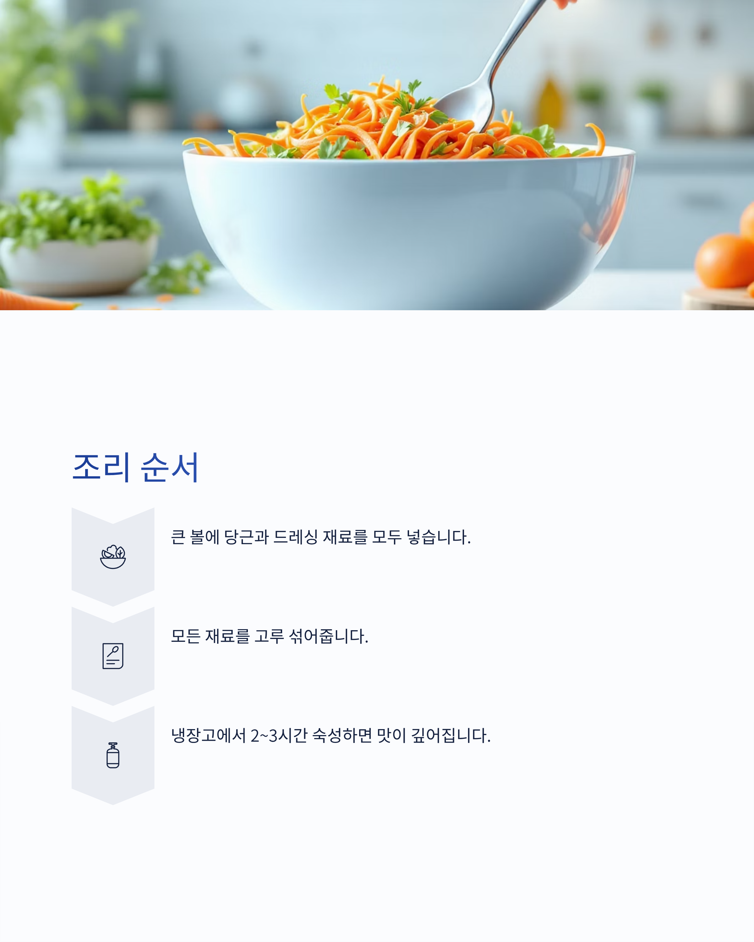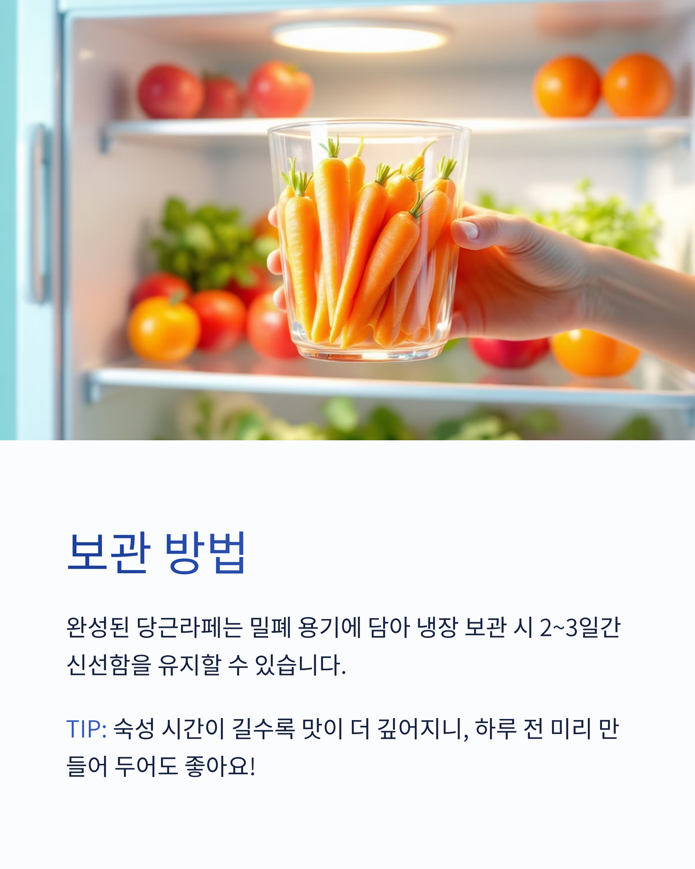 - 완성된 당근라페는 밀폐 용기에 담아 냉장 보관 시 2~3일간 신선함 유지.