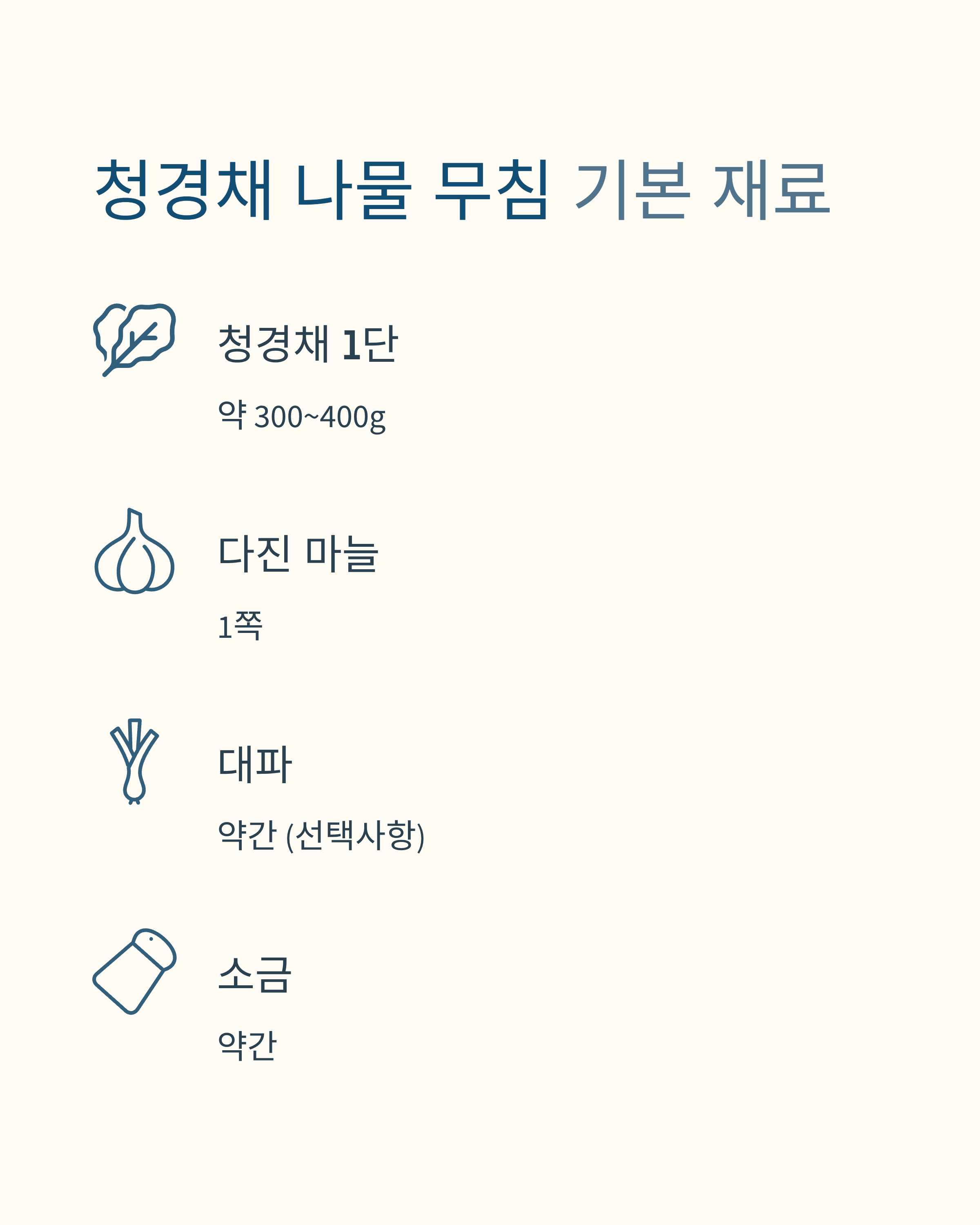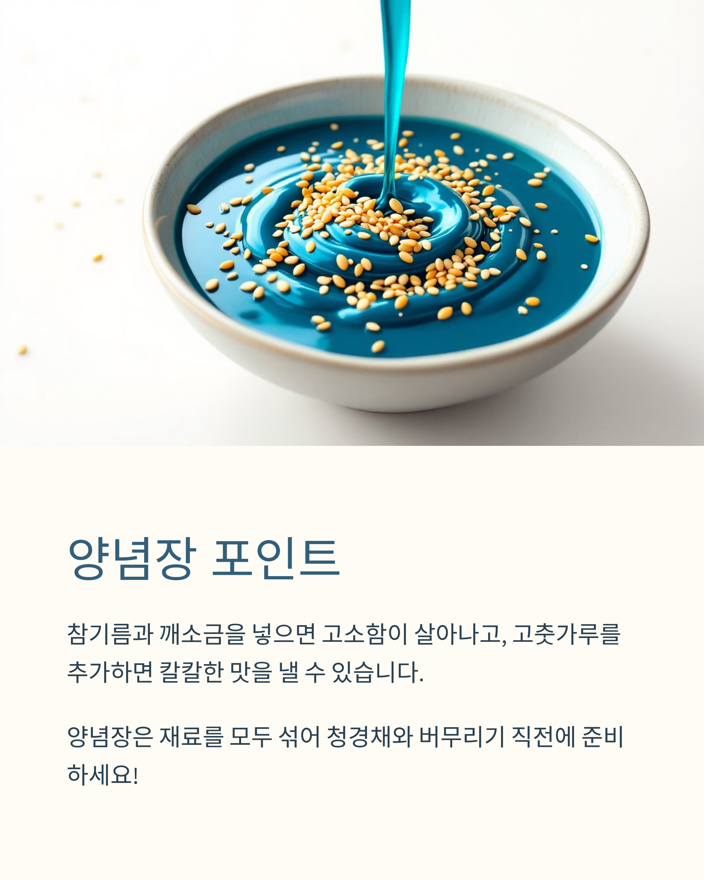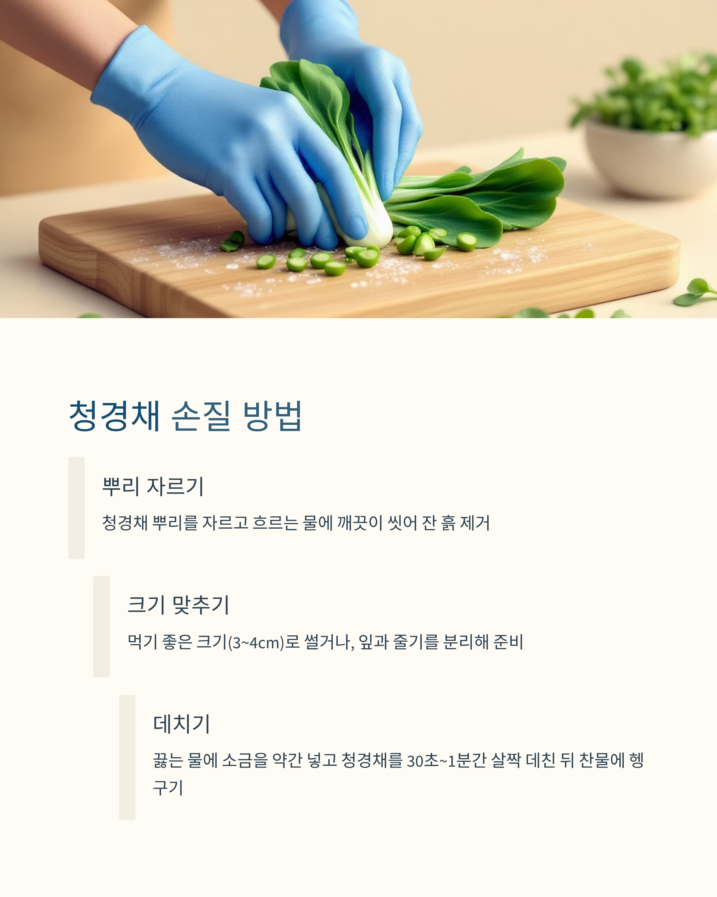 - 끓는 물에 소금을 약간 넣고 청경채를 30초~1분간 살짝 데친 뒤 찬물에 헹궈 아삭함 유지.