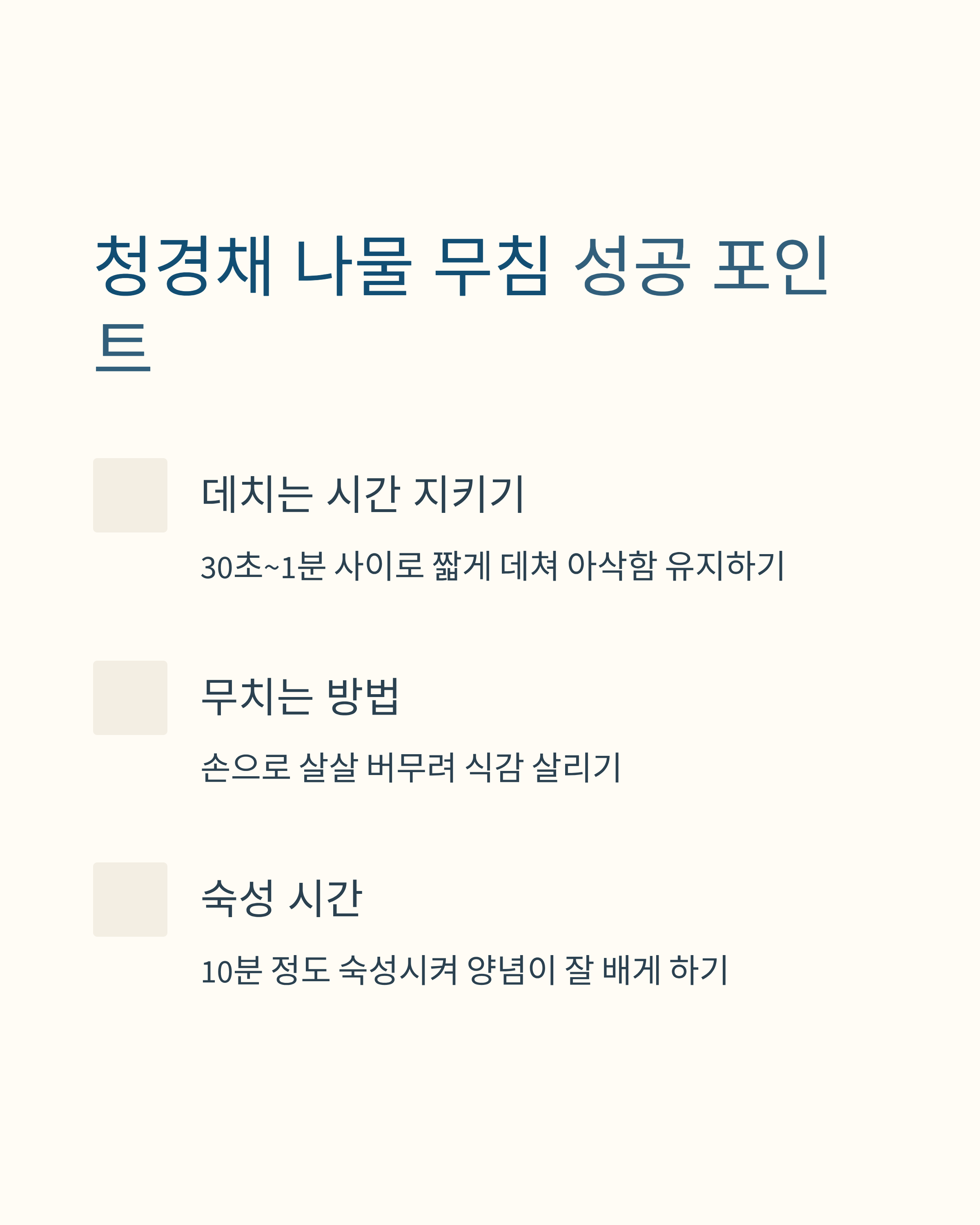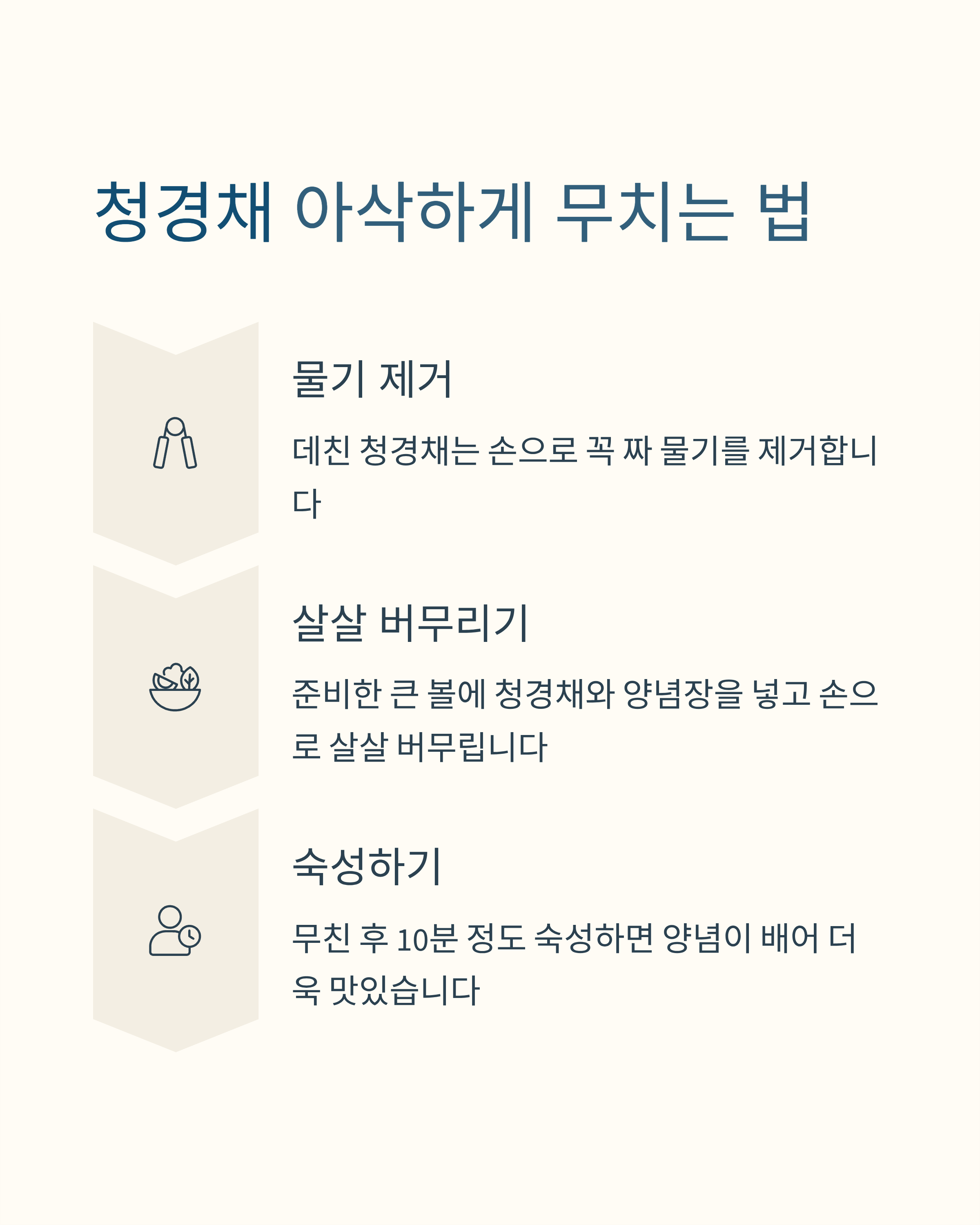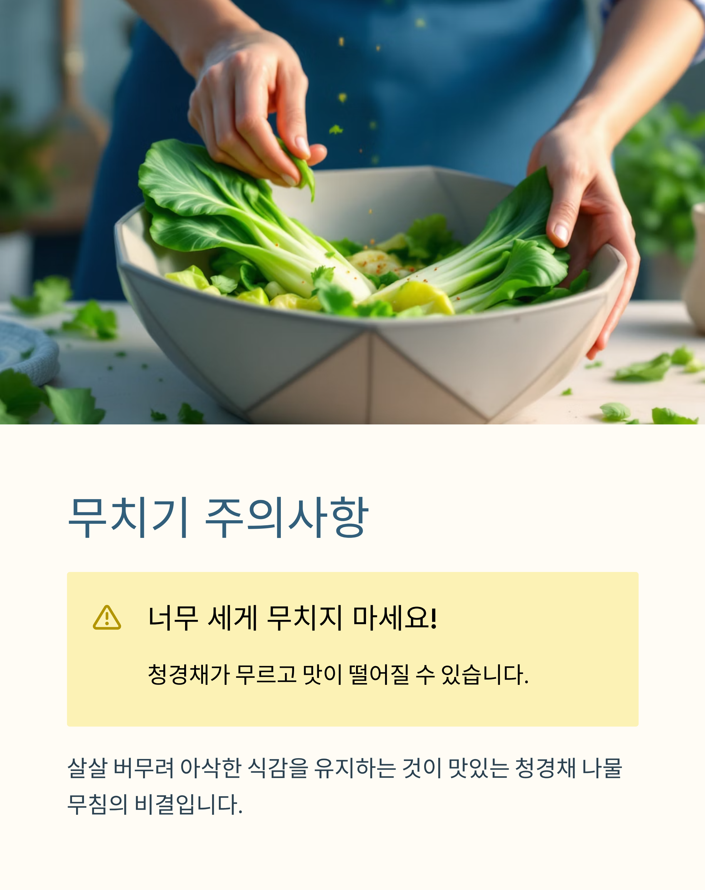 - 너무 세게 무치면 청경채가 무르고 맛이 떨어짐.