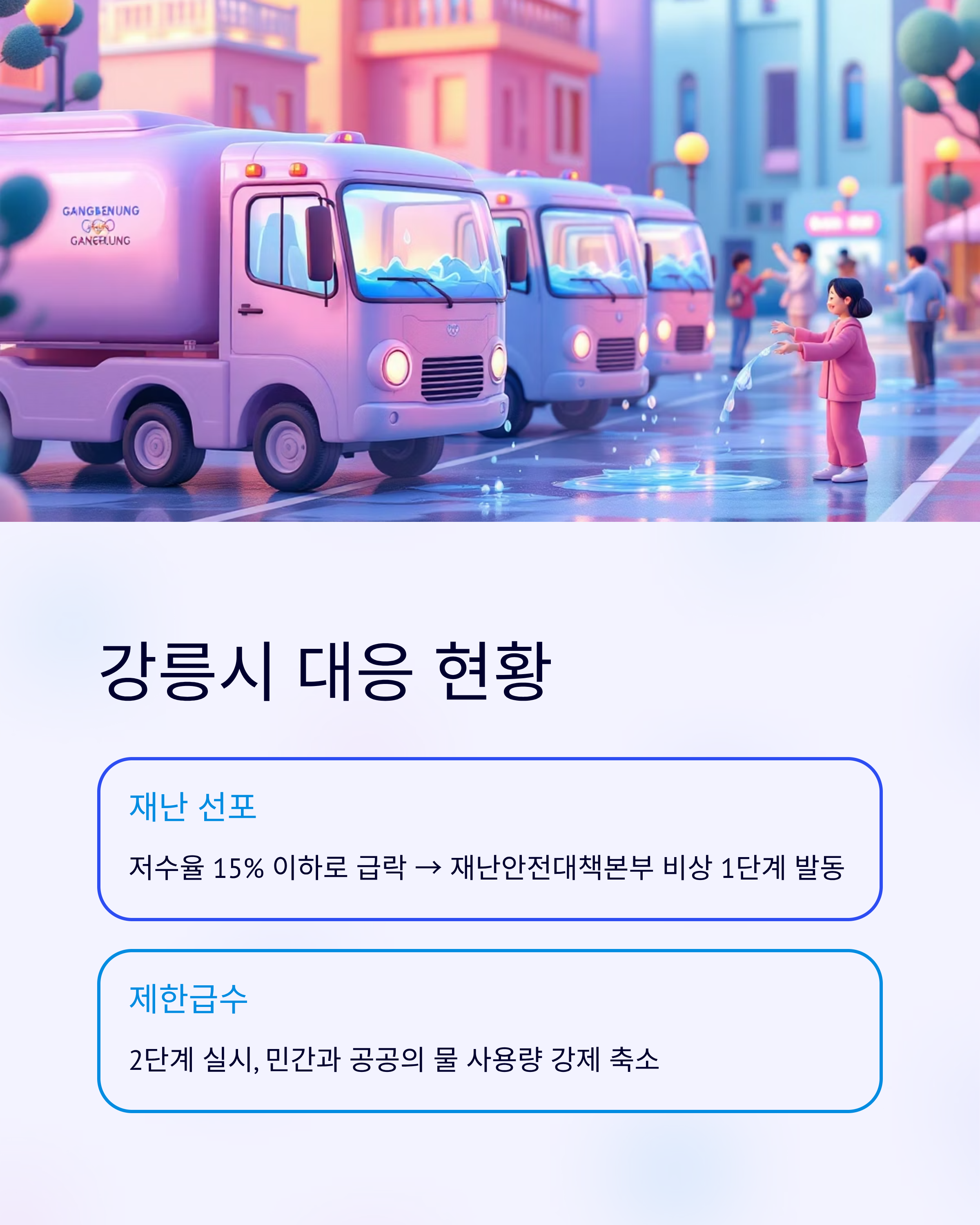 A2. 현재는 제한급수, 급수 차량 투입, 공공시설 물 절약 등으로 대응하고 있습니다. 하지만 강릉 가뭄 원인을 근본적으로 줄이려면 지속적인 수자원 확보와 절수 생활화가 필요합니다.