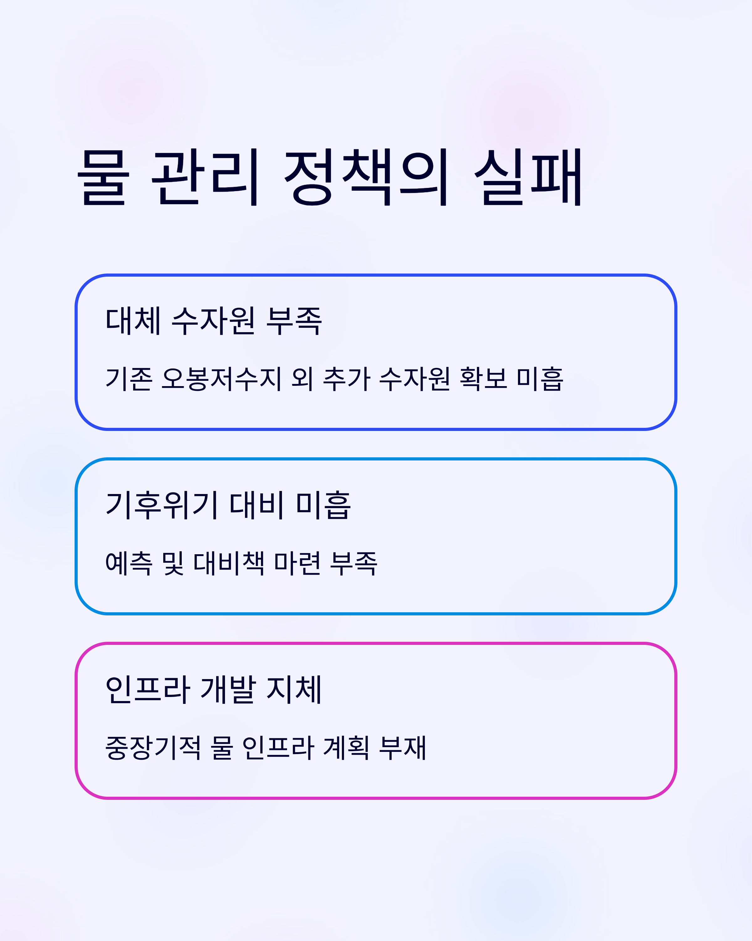 - 중장기적 물 인프라 개발 계획이 지체됨