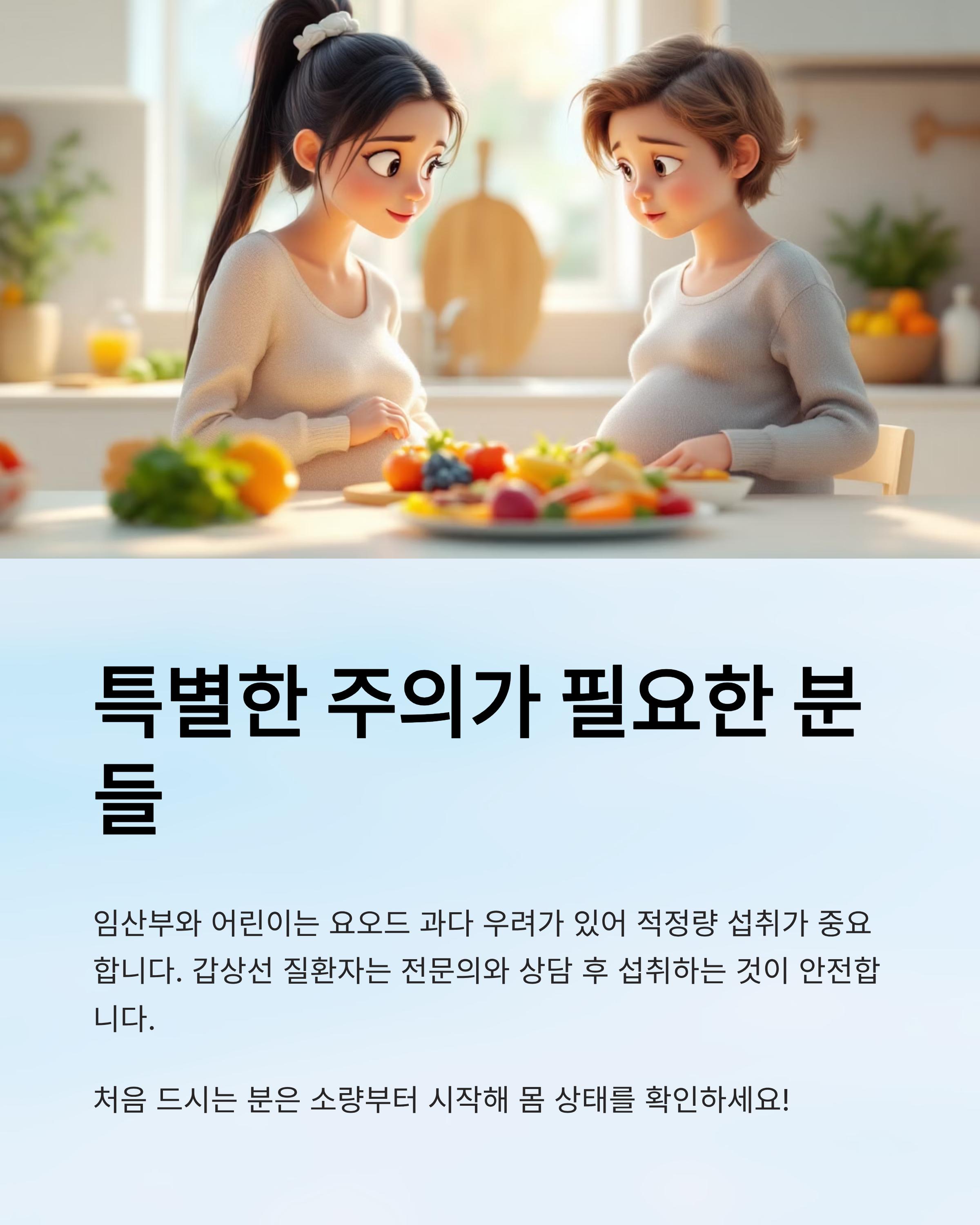 - 특히 갑상선 질환 환자는 전문의와 상담 후 섭취하는 것이 안전합니다.