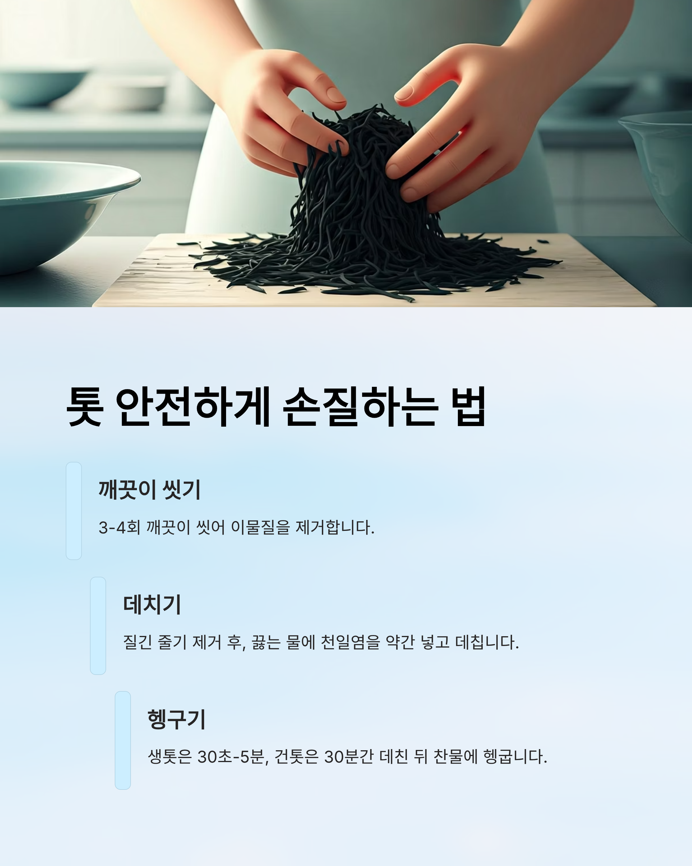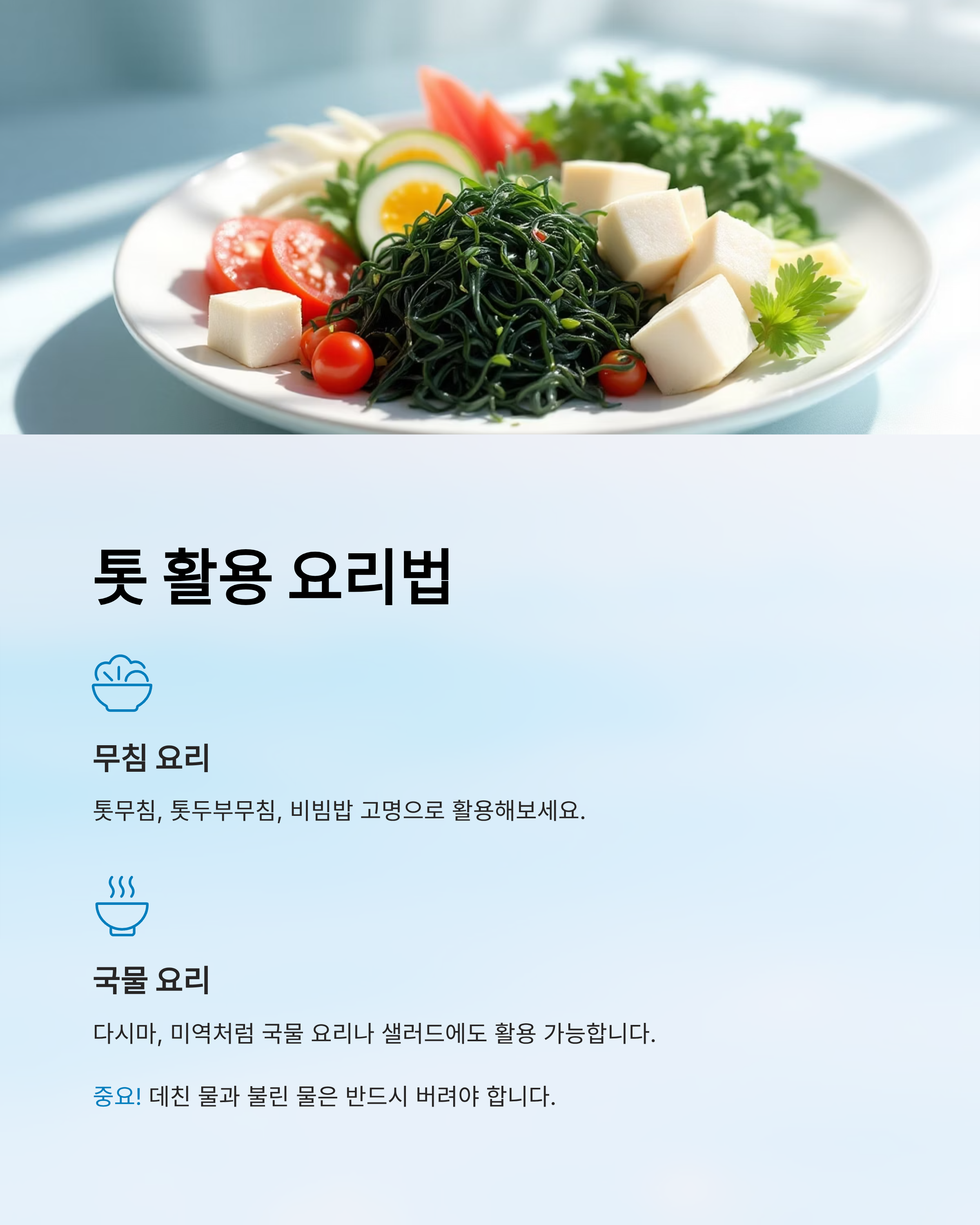 무침, 국, 두부무침, 샐러드 등 다양한 조리법으로 활용할 수 있으니, 안전하게 손질해 건강한 식단에 톳을 더해보시길 바랍니다.