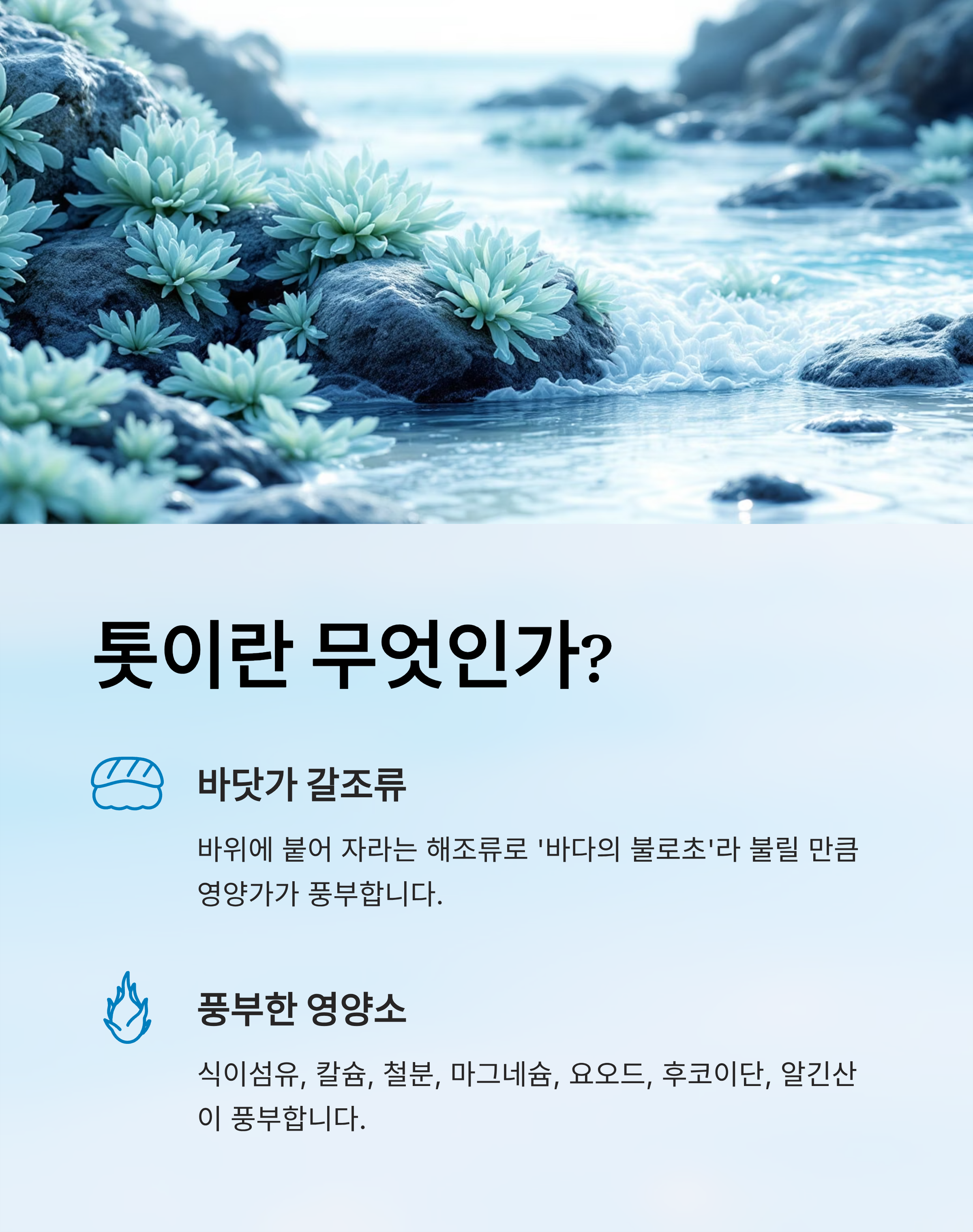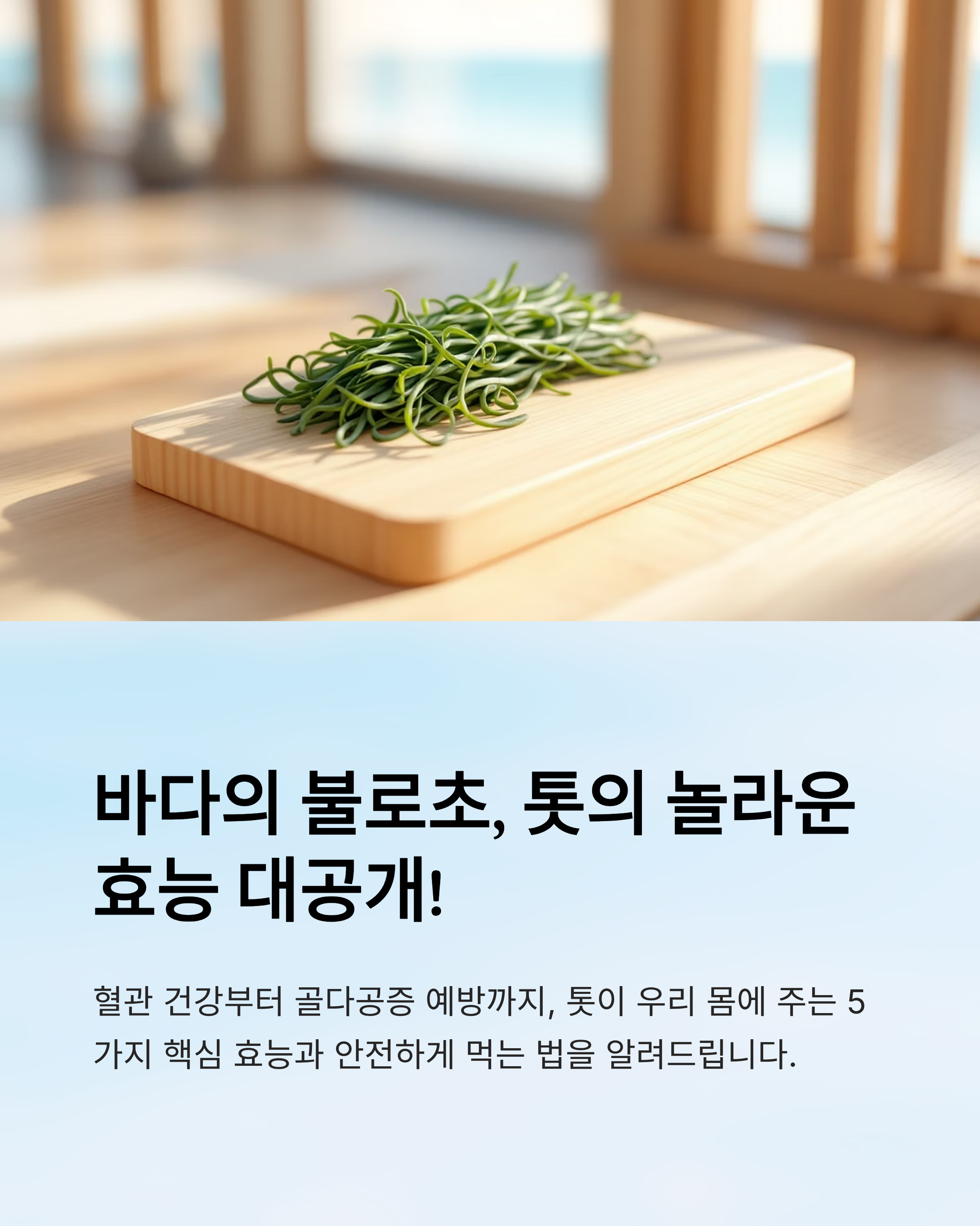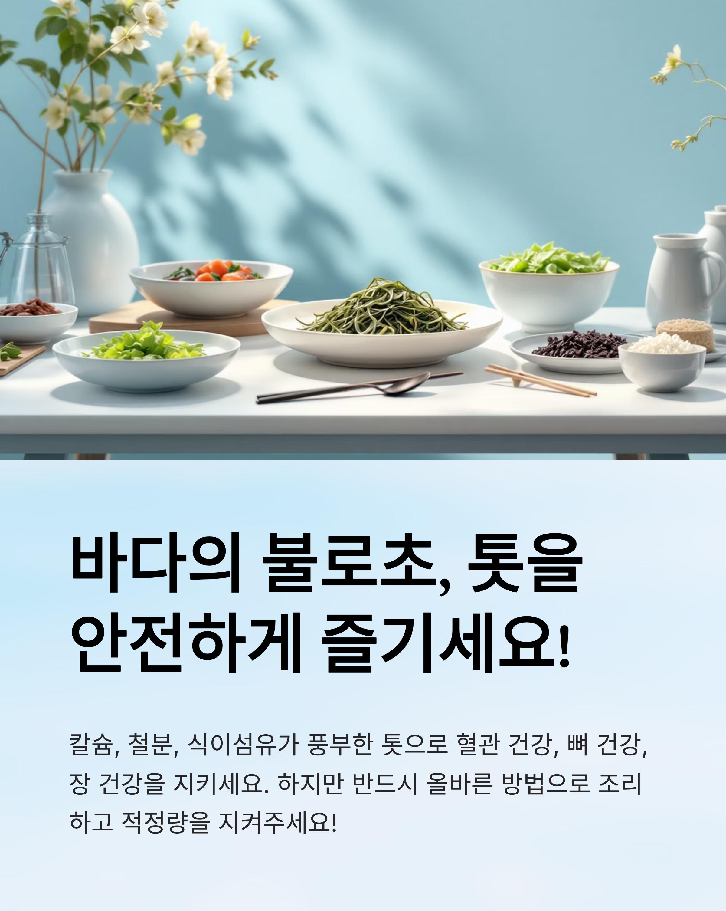 톳은 칼슘, 철분, 식이섬유가 풍부한 해조류로, 혈관 건강, 골다공증 예방, 장 건강 개선에 탁월한 효능을 가지고 있습니다. 하지만 무기비소와 요오드 함량으로 인해 반드시 데쳐서 섭취하고, 적정량을 지키는 것이 중요합니다.
