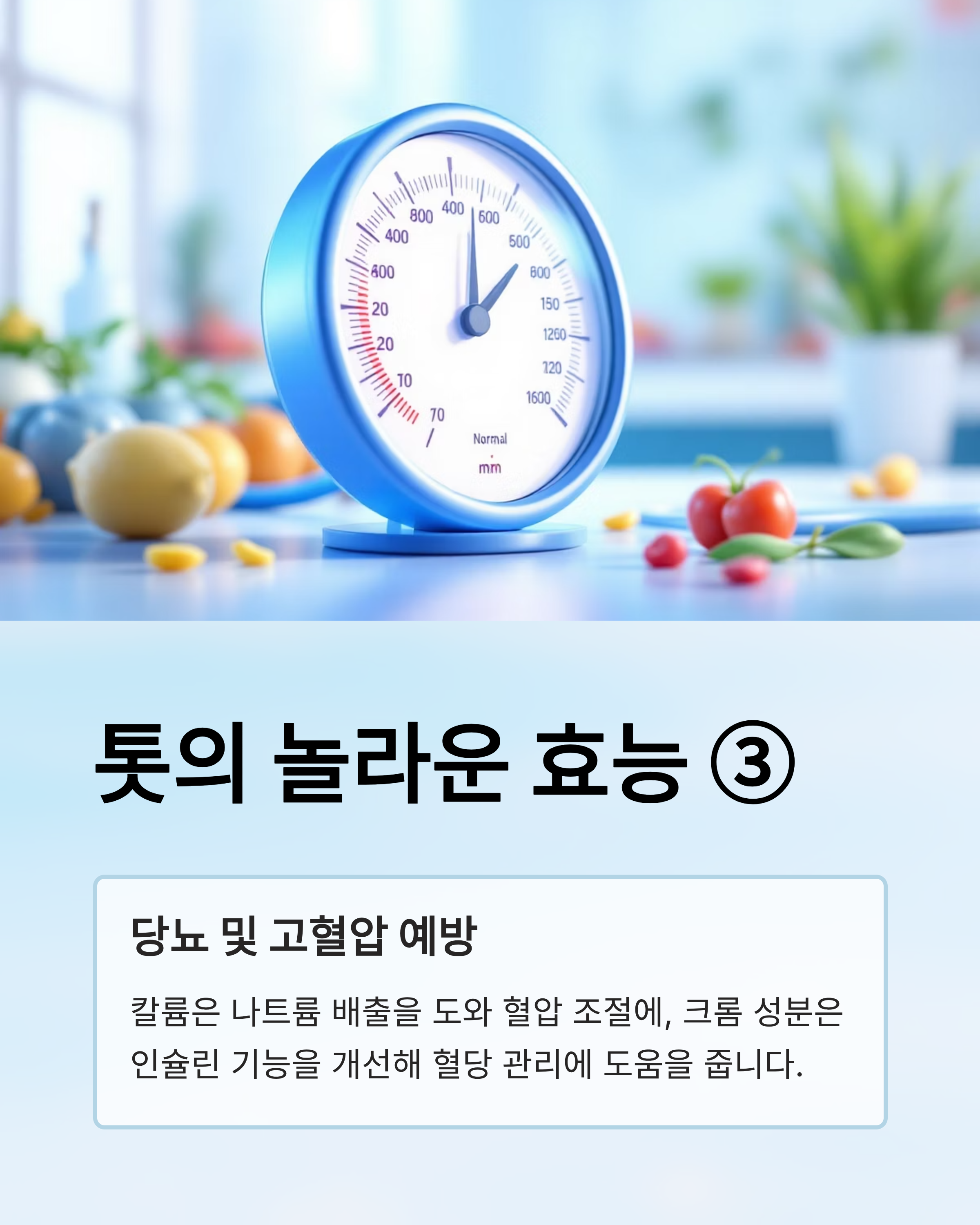 - 톳 속 칼륨은 나트륨 배출을 도와 혈압 조절에 도움을 줍니다.