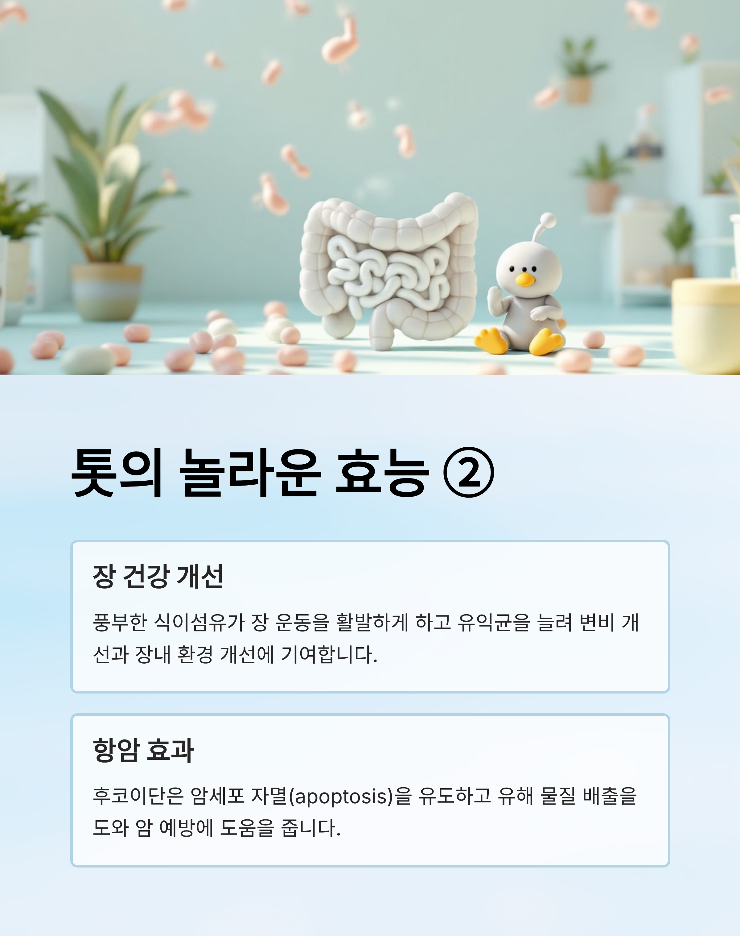 - 톳에 함유된 후코이단은 암세포 자멸(apoptosis) 유도와 함께, 유해 물질 배출을 돕는 것으로 알려져 있습니다.