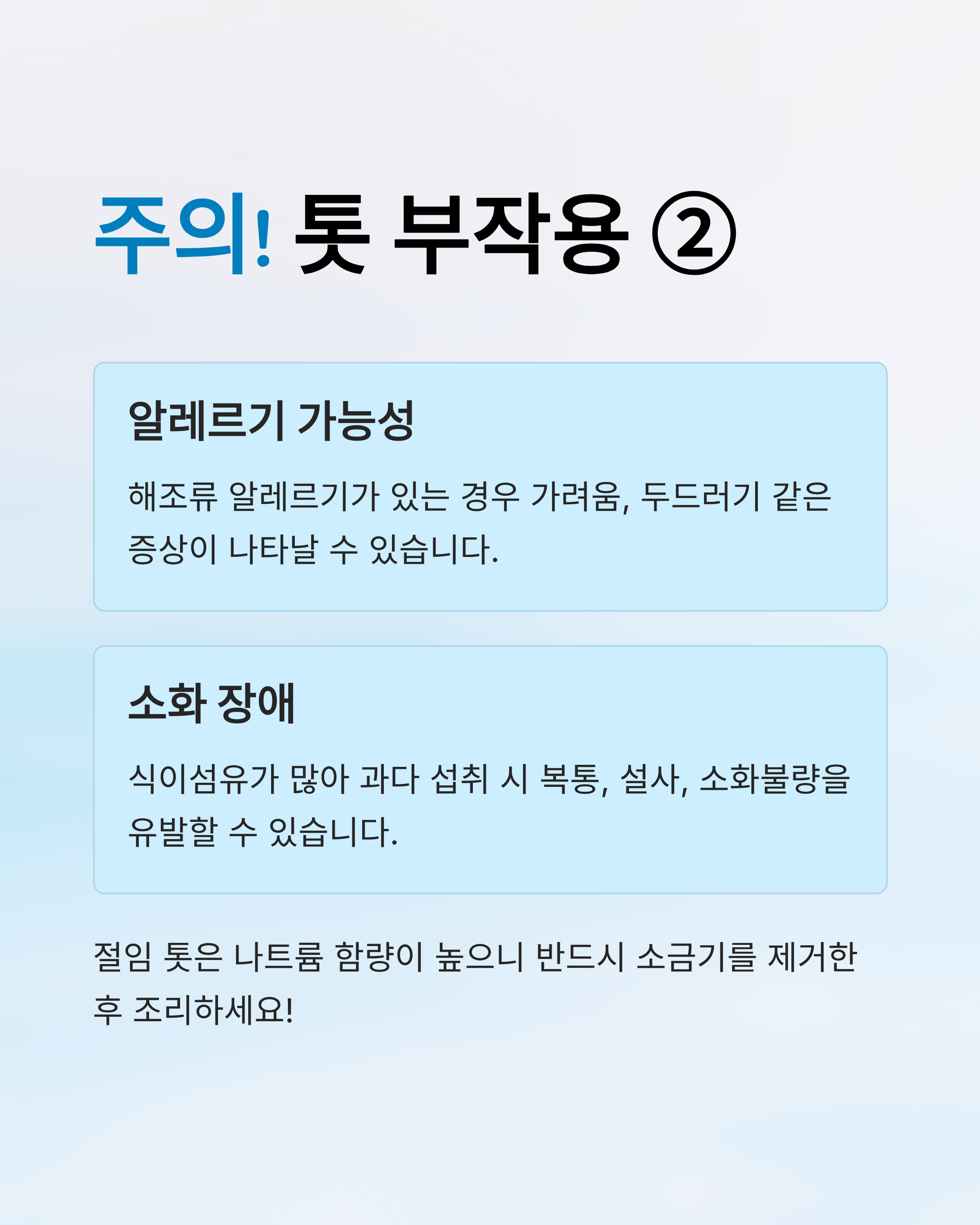- 톳에는 요오드가 많이 들어 있어 하루 권장량 이상 섭취 시 갑상선 기능 이상이 올 수 있습니다.